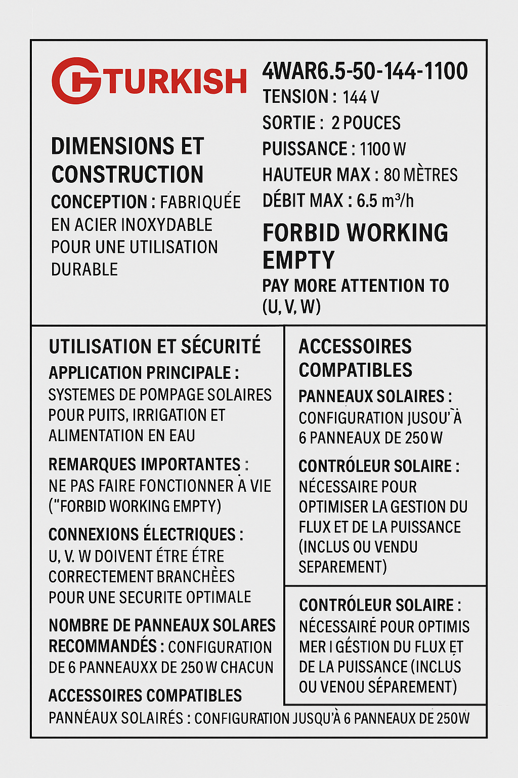 Offrez à vos espaces extérieurs un éclairage puissant et durable avec ce projecteur solaire LED de 100 watts. Parfait pour les grandes surfaces comme les jardins, les cours, les parkings et les espaces commerciaux, ce projecteur offre une solution d’éclairage écologique et économique grâce à son alimentation 100 % solaire. Caractéristiques : Puissance : 100 Watts Type de lumière : LED ultra-lumineuses pour une illumination intense et uniforme Source d\'énergie : Énergie solaire avec un panneau photovoltaïque haute efficacité inclus Matériau : Boîtier robuste en plastique renforcé, résistant aux intempéries et aux UV, idéal pour une utilisation en extérieur Installation : Montage mural ou sur poteau avec un kit de fixation inclus, facile à installer sans câblage électrique Autonomie : Fonctionne jusqu\'à 10-14 heures après une charge complète, assurant un éclairage fiable toute la nuit Capacité de charge : Panneau solaire de grande taille et haute performance pour une recharge rapide et efficace Économie d\'énergie : Système entièrement autonome, alimenté par l’énergie solaire, réduisant les coûts d’électricité Résistance aux intempéries : Certification IP65, garantissant une protection contre la pluie, la poussière, et les conditions climatiques extrêmes Fonctionnalités : Allumage automatique à la tombée de la nuit et extinction au lever du jour grâce à un capteur de luminosité intégré; possibilité de contrôle manuel ou via télécommande pour des réglages personnalisés Avantages : Puissance maximale : Avec ses 100W, ce projecteur offre une couverture lumineuse large et puissante, idéale pour sécuriser et éclairer les grandes surfaces Installation sans contraintes : Aucune connexion électrique nécessaire, réduisant les coûts d\'installation et facilitant la mise en place Durabilité et performance : Construit pour durer, avec des matériaux de qualité industrielle et des composants résistants aux environnements extérieurs Éclairage écologique : Fonctionne entièrement à l’énergie solaire, soutenant une approche durable et réduisant l\'impact environnemental Dimensions : Panneau solaire : Dimensions augmentées pour capter un maximum d’énergie (vérifiez les spécifications exactes selon le modèle) Projecteur : Design moderne et fonctionnel, conçu pour un impact visuel minimal tout en offrant une luminosité maximale Applications : Idéal pour les applications résidentielles et commerciales, ce projecteur solaire de 100W est parfait pour éclairer les grands jardins, parkings, zones industrielles, stades, et tout autre espace nécessitant un éclairage extérieur puissant et fiable.